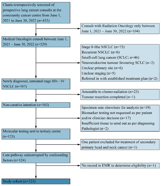 A retrospective chart review was conducted of newly diagnosed patients with advanced NSCLC treated at a regional cancer centre affiliated with a large community hospital from 1 June 2021 to 30 June 2022. Eligible patients were those ≥18 years of age with biopsy-proven stage IIIb/c NSCLC not amenable to curative intent chemo-radiation, or stage IV NSCLC, with biopsy specimens sent to the designated molecular reference laboratory (MRL). Patients treated in the curative setting were excluded as the role of biomarkers for neoadjuvant and adjuvant therapy was not yet established during the time period of interest. The study was conducted according to the World Medical Association Declaration of Helsinki and approved by the Waterloo-Wellington Research Ethics Board with a waiver of consent (WWREB 2023-0757).