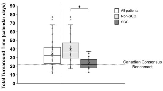 Total turnaround time (Total TAT) depicted across all patients (white bar) and divided into non-SCC (light grey bar) and SCC (dark grey bar) patients with individual participant data (small circles). The median and mean are represented by a horizontal solid line and an X in the box plot. The horizontal dashed line across the figure represents the Canadian Consensus benchmark of 21 calendar days for total TAT. The median total TAT across all patients was 32.5 (IQR 23–42) calendar days. The median total TAT for non-SCC patients was 36.5 (IQR 29.5–47) calendar days and 22 (IQR 18–28) calendar days for SCC patients. An asterisk denotes significant differences between non-SCC and SCC groups.