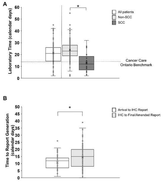 Graphs depicting laboratory time in non-SCC and SCC patients (A) and partial (IHC) and final (NGS) report generation in non-SCC patients (B). The horizontal line and X in the box plot represent the median and the mean, respectively. (A) Laboratory time depicted across all patients (white bar) and divided into non-SCC (light grey bar) and SCC (dark grey bar) patients with individual participant data (small circles). The median laboratory time across all patients was 21 (IQR 14–27) calendar days. The median laboratory time was longer for non-SCC than SCC patients and also longer for non-SCC patients compared to the provincial benchmark of 14 calendar days (dashed horizontal line). An asterisk denotes significant differences between non-SCC and SCC patients. (B) Partial IHC (white bar) and final NGS (light grey bar) report time for non-SCC patients with individual participant data (small circles). The median specimen arrival to partial IHC report generation was 12 (IQR 7–14) calendar days, while the median partial IHC report to final amended genetic report generation was 15 (IQR 8–20) calendar days. An asterisk denotes significant differences between time to IHC report generation and time to final amended genetic report generation.