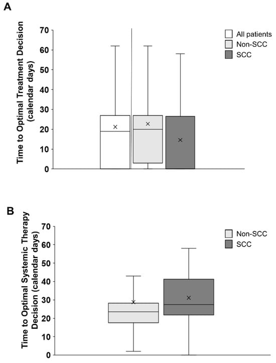 The median time to optimal treatment decision across all patients irrespective of histology was 19 (IQR 0–27) calendar days. The median TOTD was 20 (IQR 3–27) calendar days for non-SCC and 0 (IQR 0–26.5) calendar days for SCC patients (Figure 6A). There were no significant differences between the two groups owing to the large variability in the results (p = 0.08). When excluding patients who were prescribed best supportive care, and only considering patients in whom systemic therapy was being considered, the time to optimal systemic therapy decision (TOTSD) was 21.5 (IQR 10.5–28) calendar days. When evaluated by histology subtype, TOTSD was a median of 23.5 calendar days for non-SCC patients (IQR 17.5–28.2) and a median of 27.5 (IQR 21.7–41.2) calendar days for SCC patients (Figure 6B). There were no significant differences between the two patient groups (p = 0.21).