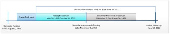 Adult patients with HER2+ breast cancer receiving neoadjuvant/adjuvant trastuzumab between 2016 and 2021 were included in the study. Breast cancer diagnosis (ICD-O-3: C50) was identified from the Ontario Cancer Registry (OCR), and receipt of trastuzumab was identified from the NDFP database. The treatment group included patients receiving any biosimilar trastuzumab brand from the start of funding in November 2019 to June 2021. The historical comparator group included patients receiving Herceptin from June 2016 to October 2019. A historical comparator group was used due to the biosimilar trastuzumab funding policy requiring new patients starting treatment with trastuzumab to receive biosimilar as opposed to reference trastuzumab. Herceptin has been used for HER2+ breast cancer since 2005; however, we included only those receiving Herceptin as far back as June 2016 to improve the comparability of treatment patterns received by patients in the treatment and comparator groups (Figure S1). The index date was the date of receipt of the first dose of biosimilar trastuzumab or Herceptin. Patients were followed until 30 June 2022 (Figure 1).