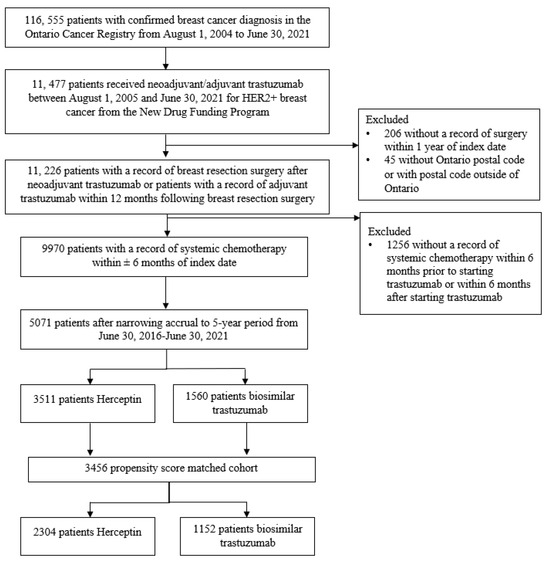 This was a population-based, retrospective cohort study comparing the safety and effectiveness of biosimilar trastuzumab to Herceptin among patients with adjuvant HER2+ breast cancer in the real-world setting of Ontario, Canada, using administrative health data housed at Ontario Health (Cancer Care Ontario). All Ontario patients receive universal coverage for publicly funded intravenous oncology drugs administered at out-patient hospitals and cancer centers [3].