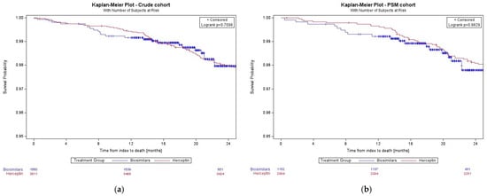 In the effectiveness analysis, Kaplan–Meier methods were applied to estimate OS for treatment groups, and the log-rank test was applied to measure the difference in OS between treatment groups for crude and PSM cohorts. Cox proportional hazards regression was used to estimate the risk of mortality, as reported by hazard ratios (HRs) and 95% CIs, for crude and PSM cohorts. A propensity-score-matched analysis was used to estimate the risk of mortality. Statistical significance was <0.05 for all two-sided p-values and not adjusted for multiplicity. All analyses were conducted in SAS version 9.4 (SAS Institute, Cary, NC, USA).