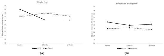 Two-level linear modeling analyses revealed statistically significant differences between the groups (PC-PEP vs. waitlist-control) from baseline to 6 months (Table 2A) for both weight (p < 0.001) and BMI (p < 0.001). However, by the end of the year, these differences were no longer statistically significant (p = 0.8 for weight and p = 0.6 for BMI, respectively) (Table 2B). Pairwise comparisons showed a significant decrease in weight among men in the PC-PEP group at 6 months compared to baseline [−2.7 kg (95% CI: −4.05 to −1.4), p < 0.001], while no significant change was observed in the waitlist control group [0.68 kg (95% CI: −0.73 to 2.0), p = 0.4]. A similar pattern was observed for BMI, with a significant reduction among men in the PC-PEP group [−0.92 (95% CI: −1.3 to −0.49), p < 0.001], but not in the waitlist control group [0.24 (95% CI: −0.19 to 0.67), p = 0.3].