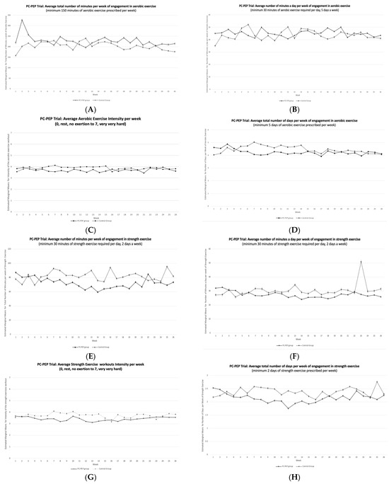 Observed means for adherence with the exercise and dietary components of the Prostate Cancer—Patient Empowerment Program (PC-PEP) program among the intervention group (who received the intervention early) and the waitlist control group (who received the intervention at 6 months post-trial start) over a 26-week period. (A) The total number of minutes per week of engagement in aerobic exercise, (B) the average number of minutes per day per week of engagement in aerobic exercise, (C) the number of days per week of engagement in aerobic exercise, (D) the average strength exercise workout intensity per week, (E) the average total number of minutes per week of engagement in strength exercise, (F) the average number of minutes per day per week of engagement in strength exercise, (G) the average total number of days per week of engagement in strength exercise, and (H) the average strength exercise workout intensity per week. These observations were made among 128 curative prostate cancer patients who underwent treatment in Nova Scotia, Canada, who participated in the PC-PEP Trial. Note: PC-PEP = Prostate Cancer—Patient Empowerment Program.