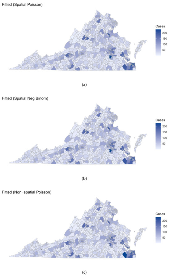 When modeling epidemiological count data, it has been seen that Poisson models with spatial components often perform better than models accounting for overdispersion such as NB models [39]. Thus, we carried out fitting for both spatial models and compared their performances based on suitable model fitting criteria. In addition, nonspatial versions of the above models were fitted for comparison to their spatial counterparts.