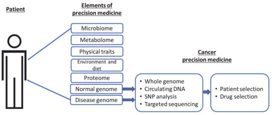 Currently, the most common application of precision cancer medicine involves pharmacogenomics, for which genomic determinants of drug metabolism (pharmacokinetics and pharmacodynamics) can be predicted from the polymorphisms and expressions of the enzymes that are involved [3,4,5]. Specifically, genomic information from normal or malignant cells is used to select an appropriate drug or patient, with the intent to avoid unnecessary treatment (Figure 1). Unlike proteomic, metabolomic, and other elements, genomic data are the least variable, making it the most stable and widely comparable across multiple platforms.