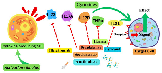 Cytokines, cytokine receptors, and associated pathways offer opportunities to target signaling pathways associated with various disease conditions. Given their roles, inflammatory cytokines and receptors, as potential therapeutic targets, have been the focus of researchers, clinicians, and pharmaceutical companies (Figure 2). The most clinically advanced of these include antibody-based anti-psoriasis drugs targeting interleukin 23 (IL23, tildrakizumab), IL17A (secukinumab, ixekizumab), or IL17R (broadalumab). Additionally, anti-TNF antibodies have been deployed for the treatment of rheumatoid arthritis and psoriasis [8,9,10]. Among the most widely used drugs are an anti-TNFα antibody drug for arthritis marketed for humans as Humira, and an anti-IL-31 antibody for canine atopic or allergic dermatitis used under the trade name Cytopoint [11]. An IL6R-targeting mAb (tocilizumab) has been approved to treat a few inflammatory conditions, including rheumatoid arthritis and cytokine release syndrome after therapies [12]. However, the utility of tocilizumab against COVID-19 could not be established unequivocally, although IL6 levels correlated with severe disease [13,14]. IL6R antagonists, tocilizumab and sarilumab, are currently recommended for severely or critically ill COVID-19 patients (Therapeutics and COVID-19: living guideline. Geneva: World Health Organization [15]). Two cytokines, IL2 and IFNα, exhibited moderate therapeutic effects for the treatment of a variety of malignant conditions and were thus approved by the Food and Drug Administration (FDA). IL2 is used for advanced metastatic renal cell cancer and melanoma [16]; IFNα is indicated for hairy cell leukemia, follicular non-Hodgkins’s lymphoma, melanoma, and AIDS-related Kaposi’s sarcoma. In 2015, IL15 was approved for treatment of solid tumors [17].