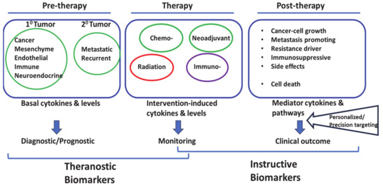 The reports briefly presented above point to the complex cytokine responses induced by chemotherapy and radiotherapy of diverse types of cancer. Elevated levels of specific cytokines may be associated with poor or favorable clinical outcomes; others may serve as potential theranostic biomarkers for treatment responses (Figure 3). Understanding the interplay between cytokines and receptors, cells of origin, and cancer therapy could lead to the development of new therapeutic approaches and personalized treatment strategies to improve patient outcomes. Further research in this field will uncover additional cytokine-related mechanisms and targets to enhance the efficacy of cancer treatment.