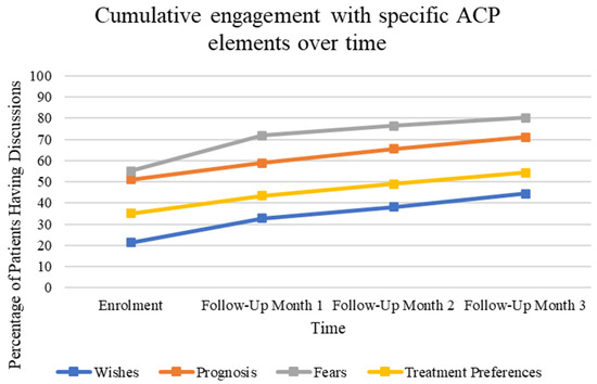 From enrollment to the third month in follow-up, cumulatively, 91.6% of patients reported discussing at least one ACP element. With regard to specific ACP elements, fears (80.2%), prognosis (71%), and treatment preferences (54.2%) were most often addressed, while important values (44.3%) were the least often discussed by three months (Figure 2).