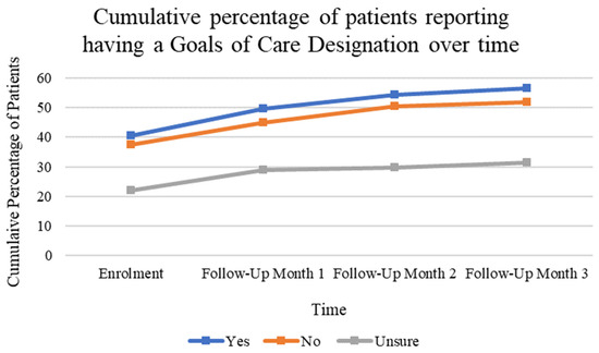 Cumulative percentage of patients reporting having a goals of care designation order at the time of enrollment and at three subsequent follow-up appointments.
