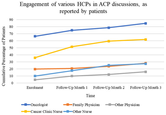 Participants reported that the majority of ACP conversations at enrollment were held with oncologists (66.4%) and cancer clinic nurses (35.9%), confirming the inter-disciplinary nature of ACP processes [28]. By the final follow-up period, patients reported a much higher frequency of involvement of oncologists (84.7%) and cancer clinic nurses (61.8%) in ACP conversations, as opposed to family physicians (from 19.8% at enrollment to 28.2% at month 3). This could reflect the frequency of cancer center visits compared to family physician contacts over the timeframe studied. This also indicates the need to ensure conversation content is shared across care sectors to provide continuity of patient experience.
