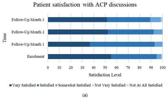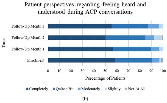 (a) Percentage of patients reporting satisfaction with ACP discussions at each listed timepoint. (b) Percentage of patients reporting feeling heard and understood during ACP discussions at each listed timepoint.