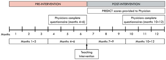 Study Schema: months 0–3: clinical data captured without any intervention; months 3–6: physicians provided with questionnaire; at the 6-month mark: educational intervention performed; months 7–9: physicians provided with PREDICT 2.1 results; months 10–12: physicians provided with PREDICT 2.1 results and questionnaire.