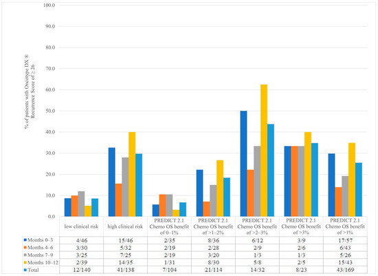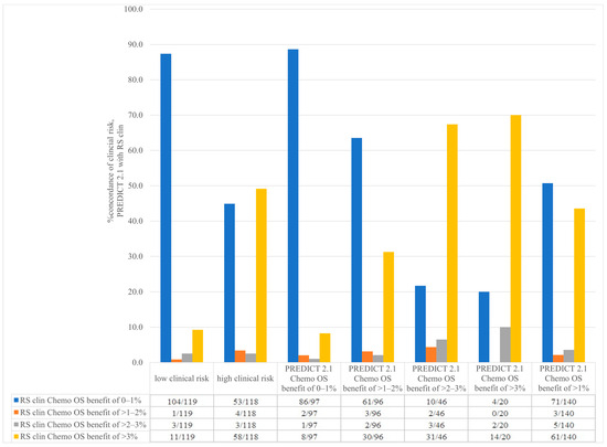 Nevertheless, we did observe that the probability of obtaining an Oncotype DX recurrence score of ≥26 seems to be associated with both clinical risk and PREDICT 2.1-estimated risk. For example, for patients with low clinical risk, the probability of obtaining a high Oncotype DX recurrence score was substantially lower compared to patients with high-clinical-risk disease (1/11.6 patients vs. 1/3.4 patients, respectively). Similar findings were observed when PREDICT 2.1 was used to estimate clinical risk and chemotherapy benefit; in patients with a predicted chemotherapy OS benefit of 0–1% who had an Oncotype DX ordered, only 6.7% had a recurrence score ≥26 compared to 25.4% when PREDICT 2.1 predicted a chemotherapy OS benefit >1%. These observations associate well with the commercial RSClin score, where 88.7% (86/97) of patients with a PREDICT 2.1-estimated chemotherapy OS benefit of 0–1% also had an RSClin-individualized chemotherapy benefit of 0–1%.