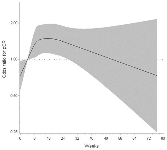 The relationship between the rest period and the odds ratio for pCR is non-linear (p = 0.033). Rest periods of 4.1–26.6 weeks were significantly associated with elevated odds of pCR with the highest odds estimated at 14.7–15.9 weeks (OR 1.49) when compared to 4.0 weeks. The gray shading represents the 95% confidence interval.