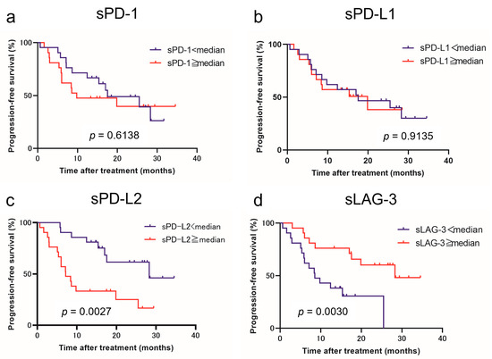 Progression-free survival (PFS) in patients with advanced renal cell carcinoma treated with immuno-oncology combination therapy according to the pretreatment soluble immune checkpoint molecules. Survival curve PFS with respect to sPD-1 (a), sPD-L1 (b), sPD-L2 (c), and sLAG-3 (d) levels.