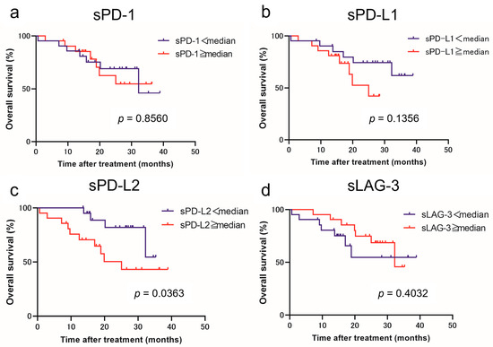 Overall survival (OS) in patients with advanced renal cell carcinoma treated with immuno-oncology combination therapy according to the pretreatment soluble immune checkpoint molecule levels. Survival curve OS with respect to sPD-1 (a), sPD-L1 (b), sPD-L2 (c), and sLAG-3 (d) levels.