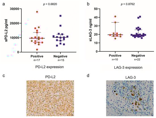 Association between sPD-L2 and PD-L2 expression in tumors (a). Association between sLAG-3 and LAG-3 expression in tumors (b). The representative immunohistochemical picture of PD-L2 expression in tumors (c). The representative immunohistochemical picture of LAG-3 expression in tumors (d).