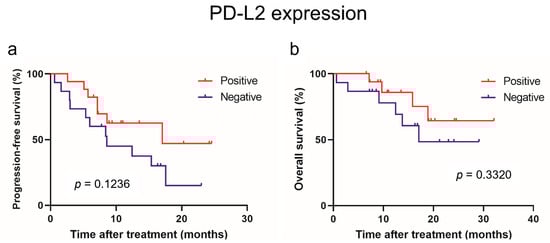 Progression-free survival (a) and overall survival (b) in patients with advanced renal cell carcinoma treated with mmune-oncology combination therapy based on immunohistochemical expression of PD-L2.