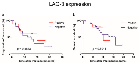 Progression-free survival (a) and overall survival (b) in patients with advanced renal cell carcinoma treated with mmune-oncology combination therapy based on immunohistochemical expression of LAG-3.