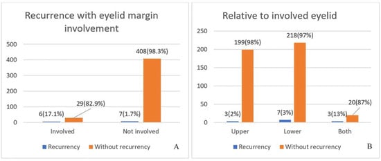 The statistical significance of the recurrences was observed for the involved and the uninvolved ciliary margin. The number of recurrences was evenly distributed between the two groups, but in percentage terms, recurrences with an involved eyelid margin accounted for 17.1% of all recurrences, compared to 1.7% with a non-involved margin, which is a large and significant difference. Involvement of the lower eyelid again resulted in more recurrences. At the temporal canthus, 23.1% of recurrences were reported, compared to 7.7% at the medial canthus (p < 0.001) (Figure 1).