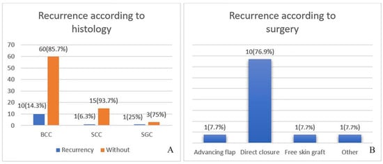 Regarding histology, the highest percentage of recurrences is found in BCC at 8%, followed by Squamous cell carcinoma (SCC) (1%) and SGC (1%) in equal percentages. Of the histological variants of BCC, the solid variant has the highest percentage of recurrences at 77.4%. The intragroup comparison showed different results. SGC recurred in 25%, BCC in 14.3% and SCC in 6.25%, meaning that SGC—with the highest recurrence rate—was the most common variant (Figure 2A).
