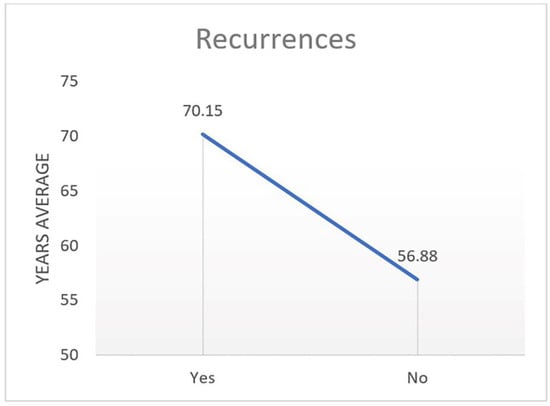 A positive correlation was observed between age and relapse (p < 0.014) (p < 0.009). Relapses are characterised by a higher average age (Figure 3).
