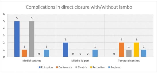 The total number of complications for all 450 operations was 32 (7%). They are divided into the following two large groups: direct closure with/without flap at 20 (4%) and plastic at 12 (3%). The complications are associated with impaired eyelid function, with the exception of those classified as “rough cicatrix with normal function”.