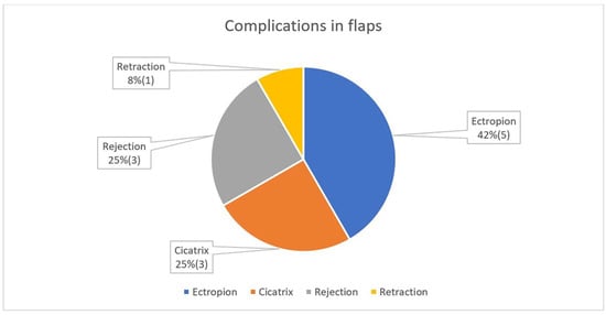 In cases where only the anterior lamella is missing, the defect is reconstructed with a flap or other skin graft; the graft exerts vertical traction. Ectropion is present (Figure 8) and it was observed in 11 cases, representing 34% of all complications.