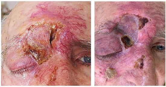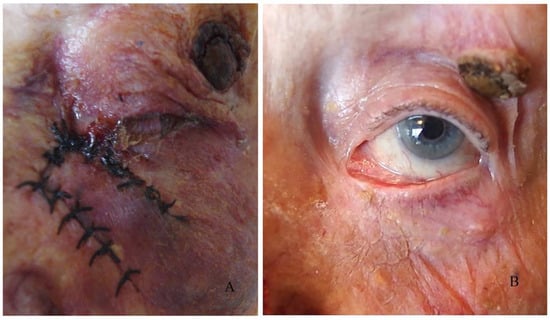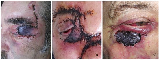There are many different opinions on the use of radiotherapy in eyelid tumours, and our practice and the world’s practice show a low frequency of preoperative irradiation [,,]. In our study, we have observed a postoperatively irradiated patient who rejected the skin grafts. Due to maceration of the surrounding tissues, new plastic surgery was impossible.