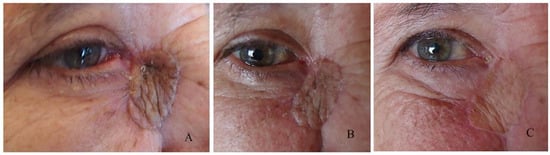 Retraction of the lower eyelid was observed in a total of four patients, which corresponds to 12.5% of all complications (Figure 6). This is caused by a lack of tissue to cover the surgical defect, resulting in scarring (Figure 7).
