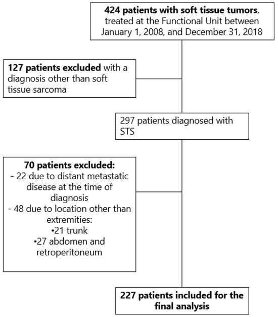 During the mentioned study period, 424 patients with tumors of the extremities and trunk were admitted to the Functional Unit of the INC; 127 of them were excluded for having a diagnosis other than STS, as were 70 patients for having a location other than the extremities or due to distant metastatic disease. In the end, 227 patients met the inclusion criteria for the study (Figure 1).