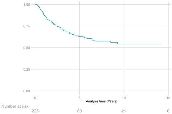 For RFS of any type (local, regional, or distant), the 227 patients provided a total of 945 years of follow-up. The median follow-up was 2.9 years (IQR: 0.1–14.2). The median survival could not be estimated because less than 50% of the patients had this outcome (Figure 3).
