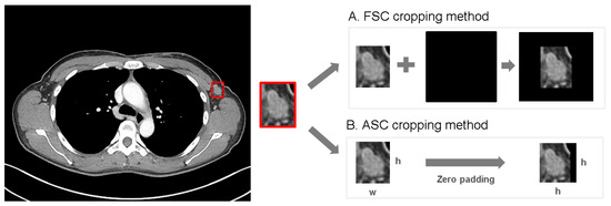 The second method is the adjustable square crop (ASC) method, which adjusts and equalizes the actual size information of the LN. In this method, bounding boxes are adjusted to form a square shape based on the longer side by applying zero padding. The longer side of the extracted bounding box is used as a reference for the square adjustment, while the shorter side is compensated using zero padding, resulting in a square shape.