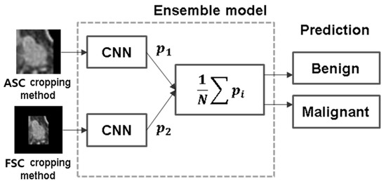 The primary objective of our study is to accurately distinguish between malignant and benign LNs using CNN architecture. To achieve this goal, we applied ensemble methods to enhance overall performance, reduce prediction variance, and improve the final classification results [15,16]. This approach involves selecting the two best-performing CNN architectures from each cropping method (FSC and ASC methods) and combining them using the unweighted average ensemble method to generate the final results. Figure 4 provides an illustration of the ensemble method.