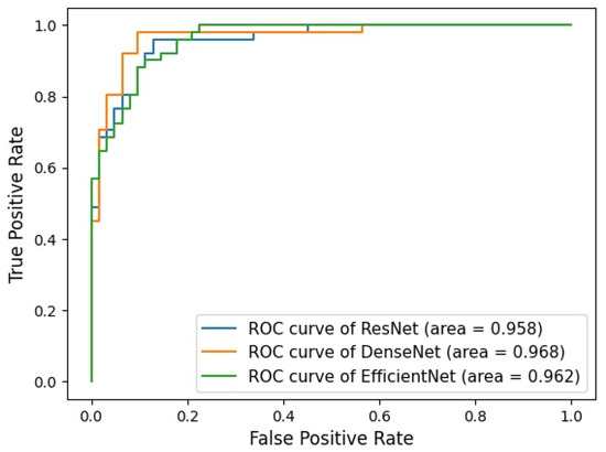 Receiver operating characteristic curve for three ensemble models classifying of benign and malignant ALN.