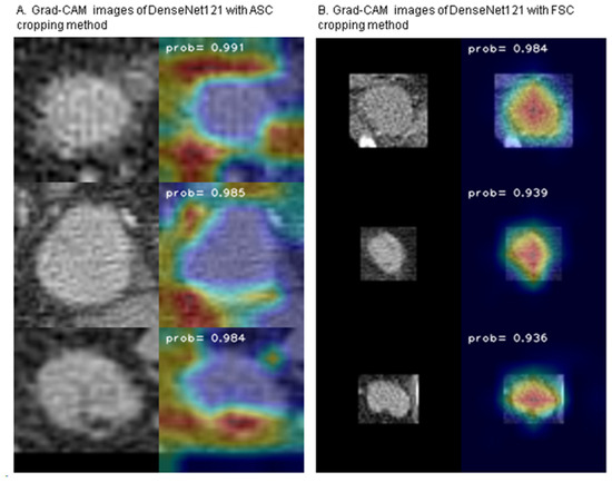 We utilized Grad-CAM to assess whether applying clinical implications to image processing affects the result of the deep learning-based analysis. Figure 6 shows representative images of original and overlaid Grad-CAM for malignant ALN using two different cropping methods (ASC and FSC methods) with DenseNet121. In the FSC method, which preserves actual size information, Grad-CAM for malignant ALN highlights the lymph nodes themselves. However, in the ASC method, which adjusts and equalizes size information, Grad-CAM tends to emphasize the margin and adjacent soft tissue of malignant lymph nodes.