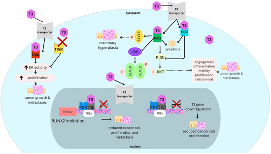 The study of THRs in BC adds a layer of complexity to an already heterogeneous disease as it is necessary to consider the different receptors and their splice variants as well as the modulated effect of TH itself. For instance, the PI3K pathway is one of the signalling pathways inhibited upon T3 interacting with THRβ. Downstream signalling of the PI3K pathway has oncogenic effects, particularly through the phosphorylation of AKT, which in turn phosphorylates targets like mTORC2, a central regulator of cell metabolism, growth, proliferation, angiogenesis, and survival [8,14]. THRβ regulates the activity of the JAK-STAT pathway, ultimately leading to an increase in apoptosis and a reduction in tumor size and proliferation [15]. However, it is important to note that very few studies differentiate between THRβ isoforms and their respective roles in signalling cascades.