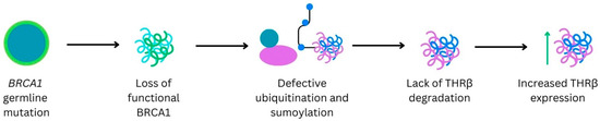Heublein et al. also performed immunohistochemistry to evaluate the expression of THRβ using anti-THRβ polyclonal antibodies (Table 2) in a patient cohort with BRCA1-associated (n = 38, 31%) and sporadic BC (n = 86, 69%). THRs were found to be expressed in the BC tissues in a nuclear fashion. Interestingly, 22% of sporadic breast cancers stained positive for THRβ, while a much higher proportion (53%) of the BRCA1-mutated tumors stained positive for THRβ. The rationale for these findings involves the understanding of the wildtype BRCA1 protein and its function in protein degradation via ubiquitination and sumoylation of nuclear receptors [18]. It has been hypothesized that mutations in BRCA1 (and thereby loss of functional BRCA1) decrease the degradation of THRβ and thereby contribute to THRβ over-expression [12] (Figure 3).