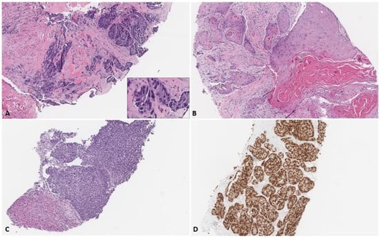 - Dizman, N.; Salgia, M.; Ali, S.M.; Wu, H.; Arvanitis, L.; Chung, J.H.; Pal, S.K. Squamous Transformation of Prostate Adenocarcinoma: A Report of Two Cases with Genomic Profiling. Clin. Genitourin. Cancer 2020, 18, e289–e292. [Google Scholar] [CrossRef] [PubMed]