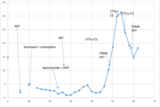 PSA levels and corresponding treatment course with time on the X axis and PSA (ng/mL) on the Y axis.