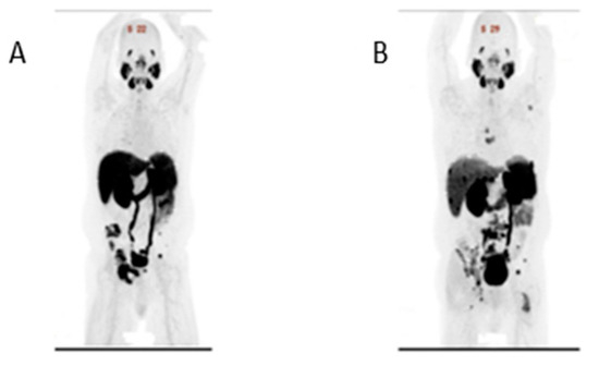The initiation of carboplatin and docetaxel, in conjunction with androgen deprivation therapy (ADT), was prompted by the SCC component identified in the patient’s prostate biopsy. He responded well to therapy with PSA decline from 14 ng/mL to 2 ng/mL and radiographic response (decrease in size and extent of hepatic metastases and lymphadenopathy and stable osseous lesions with no new sites of metastases). After completing six cycles of carboplatin and docetaxel, he continued ADT and started AR pathway inhibitor (ARPI) therapy due to his adenocarcinoma component. He started two ARPIs, apalutamide and abiraterone, on a clinical trial (Figure 2) [6]. PSA further declined during ARPI therapy, with a PSA nadir of 0.9 ng/mL. After 25 weeks of therapy, his PSA started rising to 4 ng/mL. His restaging imaging showed interval development of a single new lytic destruction and soft tissue component of the right posterior acetabular metastasis, no other new disease, decreased hepatic metastases and no change in the enlarged abdominal/pelvic lymph nodes. Lutetium-177 therapy was discussed and PSMA PET imaging was performed, which showed PSMA uptake in all known metastases: liver, lymph nodes and bone metastasis (Figure 3A). The patient opted for radiation therapy (XRT) to the single lesion’s progression, the acetabulum, and a continuation of ARPI and ADT therapy. PSA declined reaching a nadir of 1.78 ng/mL. Four months after XRT, PSA started rising again during ARPI therapy, and imaging showed a new liver metastasis and increases in the size of the soft tissue component of osseous metastasis. The patient had a repeat PSMA PET scan (Figure 3B) and opted to undergo Lutetium (177Lu) vipivotide tetraxetan therapy. Unfortunately, this therapy became unavailable due to supply issues, and the patient received one cycle of cabazitaxel and carboplatin chemotherapy before initiating PSMA-targeted therapy. Initially, the patent showed a response to Lutetium (177Lu) vipivotide tetraxetan therapy with a PSA decline from 33 ng/mL to 15 ng/mL after the first cycle. Unfortunately, PSA started rising after cycle 3, and he had radiographic progression after cycle 3 with new and enlarging pulmonary, hepatic and bone metastasis. The patient was hospitalized for altered mental status, raising concerns about leptomeningeal metastasis despite the absence of clear radiographic evidence. Although the altered mental status resolved, the patient later developed pneumonia. Opting for a transition to comfort care, he passed away.