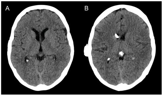 Regarding concomitant hydrocephalus, nine patients with LC suffered from communicating hydrocephalus (56%). Seven out of sixteen patients (44%) presented with obstructive hydrocephalus. Among these, four patients (57%) had obstructive hydrocephalus due to multiple intracranial metastases. In two of the seven patients (29%), the CT-confirmed obstructive hydrocephalus was caused exclusively by meningeal carcinomatosis, which obstructed the aqueduct. In one patient (14%), a single intracranial metastasis and the accompanying perifocal edema led to hydrocephalus. In all affected patients, a radiological improvement of hydrocephalus could be observed early postoperatively. For an illustrative case, see Figure 2.