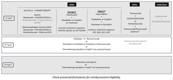 There is a minimal role for surgery in incurable GC and GEJC beyond helping with supportive care procedures—for instance, placing a stent for obstruction or placing a gastric or jejunal feeding tube in those who require enteral feeding. However, there is the potential for conversion of unresectable into resectable disease following a good response to novel, targeted, or neoadjuvant therapy, although this is rare. Radiation therapy can be beneficial as a palliative therapy, especially in the setting of bleeding tumors or localized pain due to metastatic lesions. However, chemotherapy is the main treatment for unresectable metastatic GC and GEJC. With additional lines of therapy now available, such as trifluridine–tipiracil, these patients are able to continue receiving treatment into the third and fourth lines (Figure 1) [29]. The availability of multiple biomarkers and associated targeted therapies has improved first-line treatment decision-making. Tumors with overexpression of the HER2 biomarker are treated with anti-HER2 therapies, such as trastuzumab. MSI-H and PD-L1 biomarkers support the use of immunotherapy, although there is public funding for immunotherapy regardless of PD-L1 CPS results in Canada (Figure 1). New first-line data suggest improved outcomes for the addition of pembrolizumab to trastuzumab, fluoropyrimidine-, and platinum-containing chemotherapy for HER2-positive metastatic GC and GEJC with a PD-L1 CPS of ≥ 1 [30]. Furthermore, there have been positive results of phase III clinical trials reported for the addition of zolbetuximab to standard first-line chemotherapy for metastatic GC and GEJC for patients whose tumors overexpress CLDN18.2 [27,31]. With multiple first-line targeted therapies available, if combination data are not available, sequential therapy should be considered to avoid choosing between targeted therapies. Finally, while rare in metastatic GC and GEJC, for patients whose tumors are found to have a neurotrophic tropomyosin receptor kinase (NTRK) fusion, after progression on standard treatment, therapy with larotrectinib or entrectinib would be appropriate as per the NTRK-positive tumor agnostic indication [32,33]. There are multiple other emerging biomarkers for metastatic GC and GEJC treatment being explored, including mesenchymal-epithelial transition (MET) and fibroblast growth factor receptor 2 (FGFR2), which may provide new targets for personalized treatment [24]. As new biomarkers become available and targeted treatments are discovered, they should be included in the reflexive biomarker panel testing.