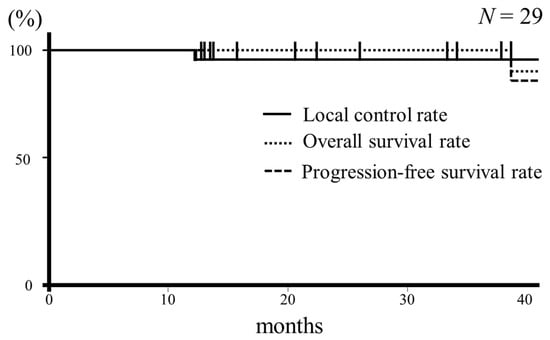 The median follow-up period was 33 months. Twenty-seven patients survived, none died of primary disease, and one patient died of other causes, including gastric cancer and renal failure. One patient had local recurrence, and the 3-year local control rate was 95.6%. The Kaplan–Meier survival curve is shown in Figure 1. At 36 months, both the local control and recurrence-free survival rates were 95.6%, and the overall survival rate was 100%.