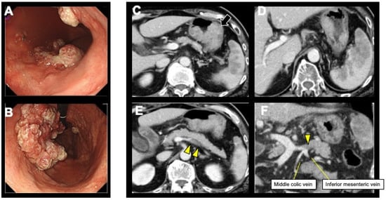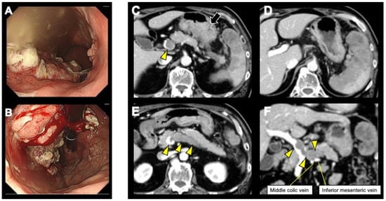 Esophagogastroduodenoscopy and contrast-enhanced abdominal computed tomography (CT) showed re-enlargement of the primary tumor (arrow) (A–C). Splenic metastasis continued to shrink (D). The thrombus in the main trunk of the portal vein disappeared and the tumor thrombus in the splenic vein shrunk (arrowhead) (E,F).