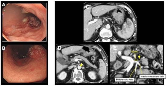 Esophagogastroduodenoscopy and contrast-enhanced abdominal computed tomography (CT) showed a reduced primary tumor and splenic metastases (A–C). Although there was a residual tumor in the peripheral splenic vein (arrowhead), the central side from the confluence of the inferior mesenteric and splenic veins was intact (with a secure margin of 12 mm from the portal vein) (D,E).