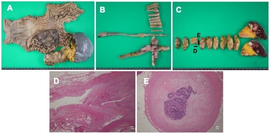Macroscopic findings of the surgical resected specimen revealed a 7.5 cm × 6.0 cm irregularly modified ulcerative lesion in the middle gastric body (Figure 4A,B). Multiple white masses with indistinct borders were observed in the spleen (Figure 4C). Pathology revealed a mixed differentiated adenocarcinoma infiltrating the sub-serosal layer with two lymph node metastases and lymphatic and venous invasion. The splenic vein was occluded up to 5 mm from the cut edge, and fibrosis was observed with adenocarcinoma (Figure 4D,E). No cancer cells were observed near the transected ends of the splenic vein. Cancer cell extension was observed in a vein around the splenic hilum, and an intravenous tumor thrombus was also observed in the short gastric veins. The tumor after preoperative therapy was classified as ypT4N1M1 stage IVB, and the histological response after preoperative therapy was grade 1a, according to the Japanese classification system [].
