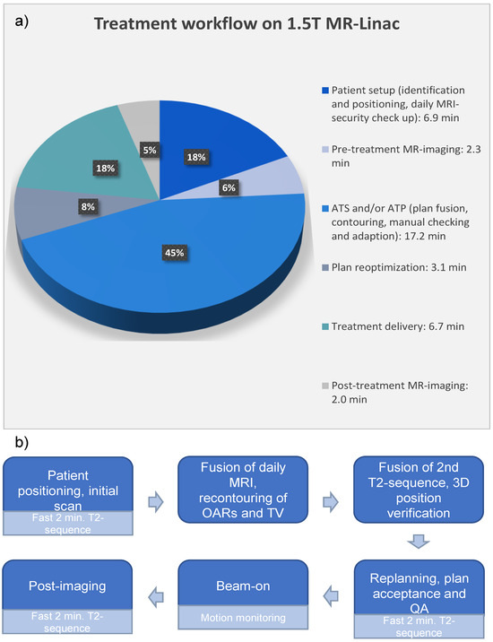 Panel (a). Pie chart demonstrating the mean time required for every step of the workflow for prostate cancer patients treated with online-adaptive UHF IGRT on the 1.5 T MR-Linac. The workflow starts with patient setup, followed by the steps listed in the clockwise rotation order. Mean total duration of each treatment session was 38.2 min. (MRI—magnetic resonance imaging, ATS—adapt to shape, ATP—adapt to position). Panel (b). Workflow graphic (OARs—organs at risk, TV—target volume, QA—quality assessment).